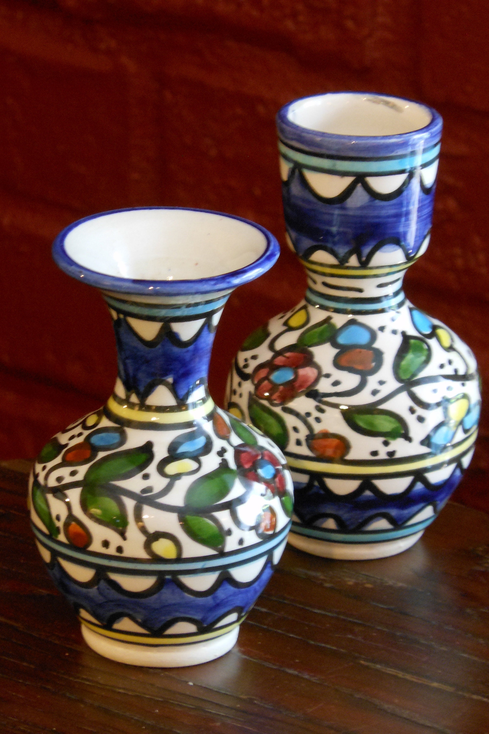 Two small hand painted bud vases: about 4 inches tall, one slightly taller. Excellent condition, without chips, cracks or signs of repair. Excellent colors: dark blue, white, green, yellow. Floral pattern. Combined weight of 6 ounces.