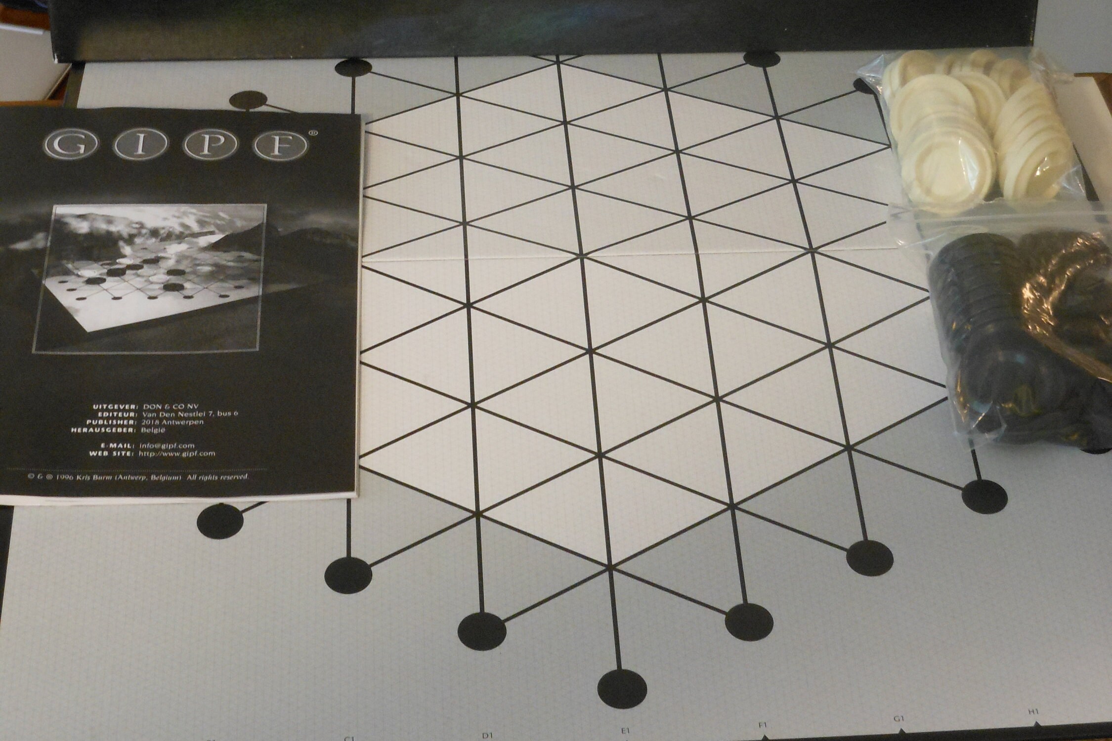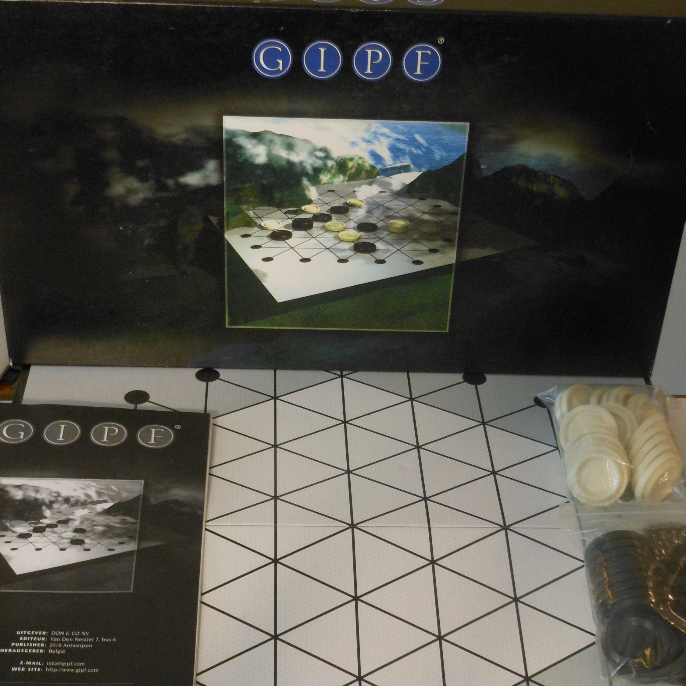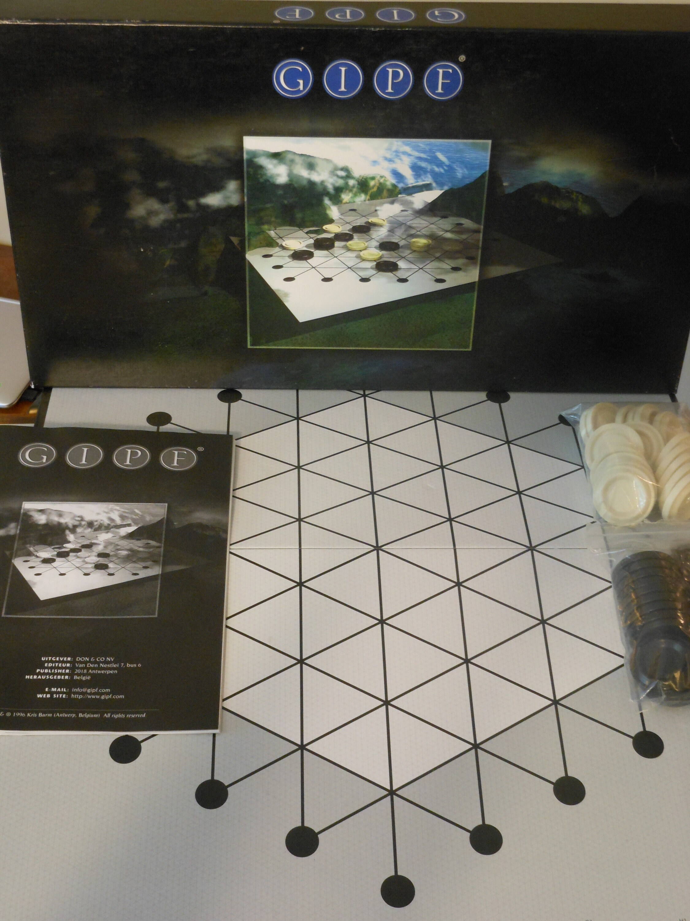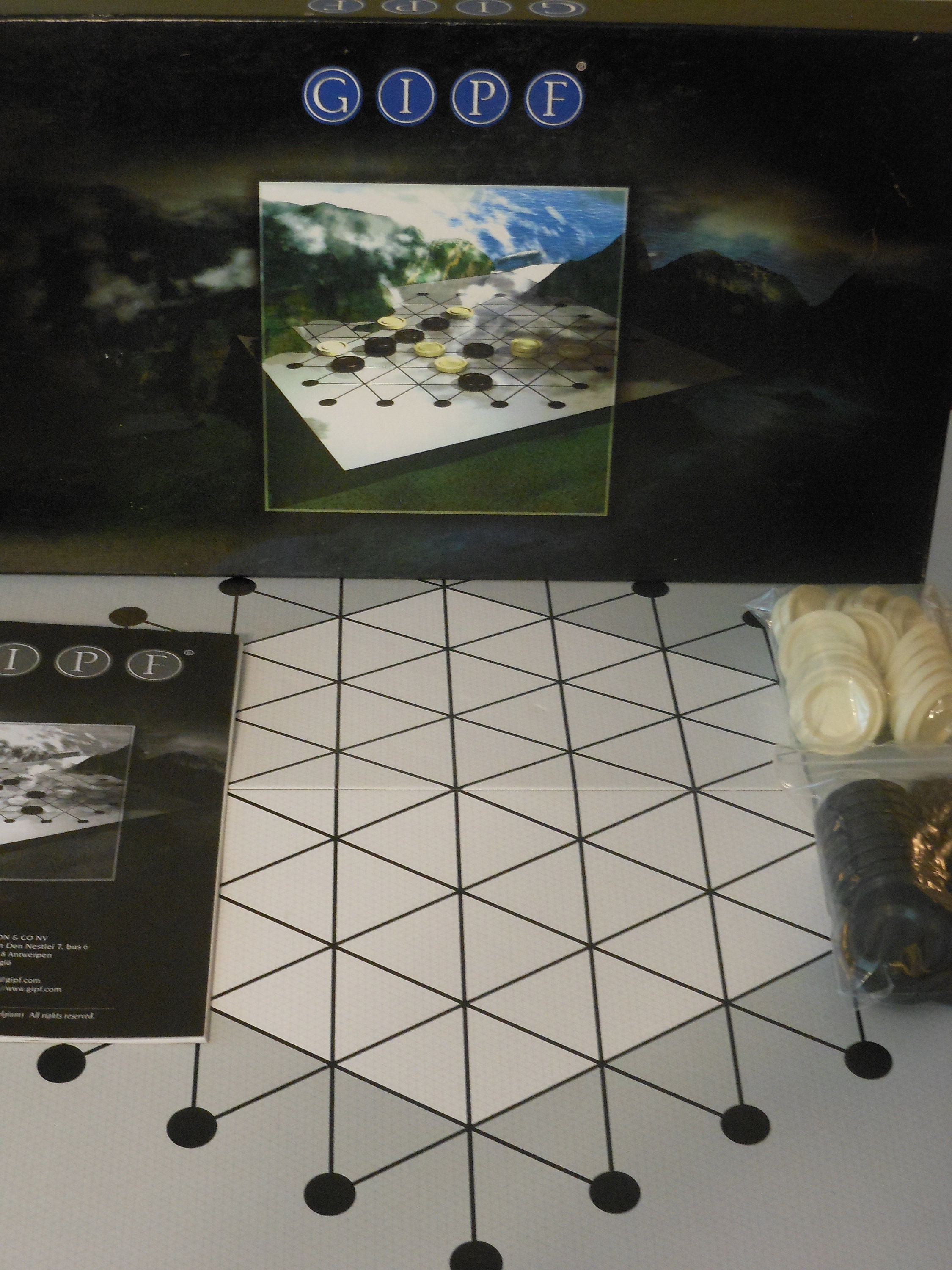 GIPF is an abstract strategy game by Kris Burm and the first of six games that make up the GIPF Project. For two players. The game changes with each move, creating a variety of possibilities. Winning is achieved by creating successive rows of four pieces or leaving the opponent with zero pieces to play. In the tournament version, winning means eliminating all the opponent's pieces. This game comes with a playing board, 17 black pieces, 17 white pieces, and an instruction book written in four languages: Dutch, French, German and English. For information on the other games in the GIPF Project, search gamer's boards. Condition of the board and pieces is excellent. Box lid has one torn corner. This game weighs 1 pound, 15 ounces.