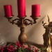Candelabra stands 16 inches tall, 13 inches wide and 6 in depth. Comes with 3 large candles which measure 6 inches high and have a base diameter of 3 inches. Candelabra is a faux wood piece, painted chalk ware. Candles have never been used. With candles, piece stands 22 inches high. Candelabra is in excellent condition, made in China. Candelabra and candles together weigh 8 pounds, 5 ounces.