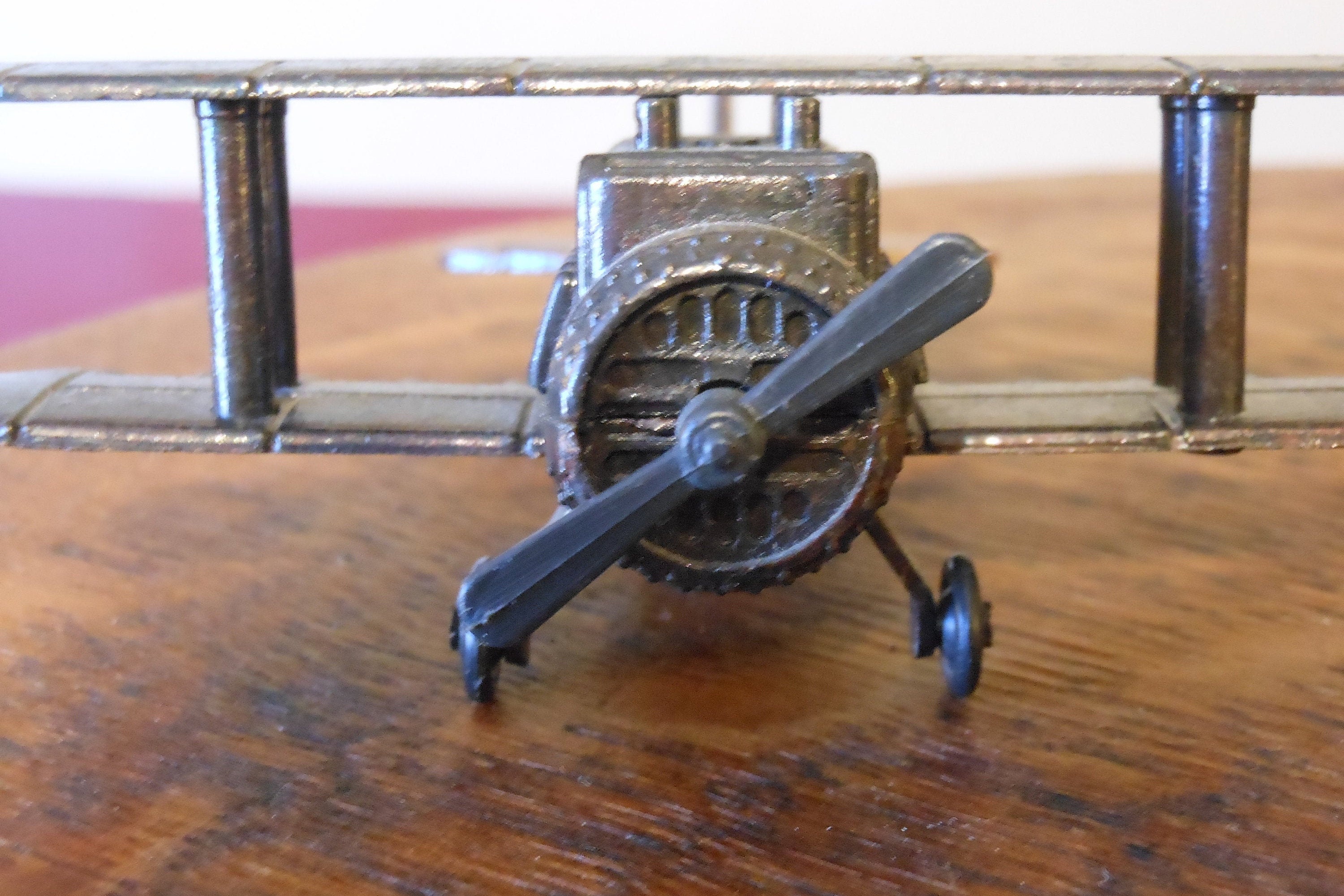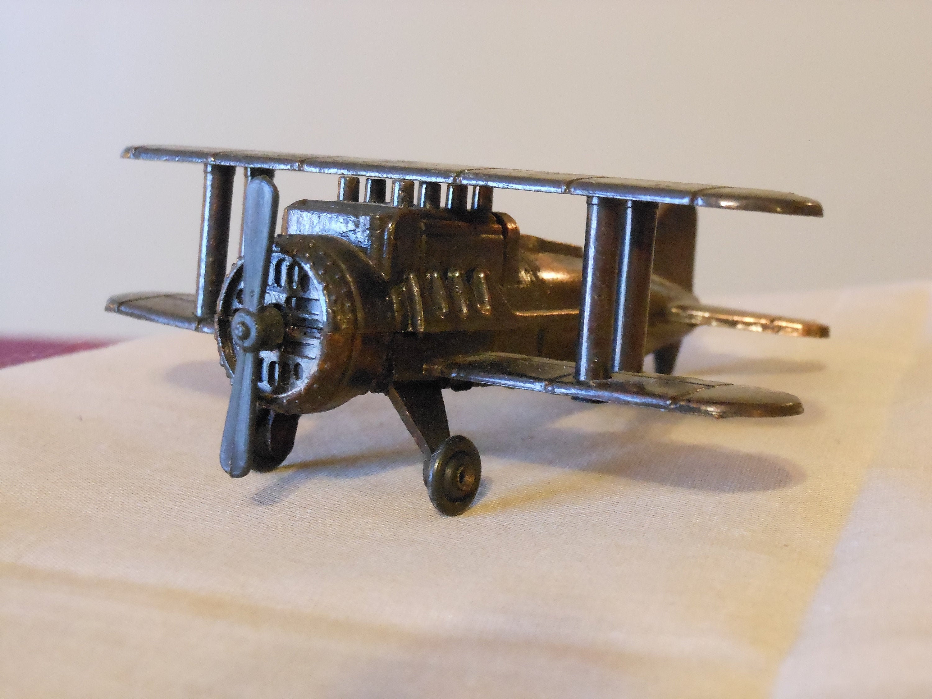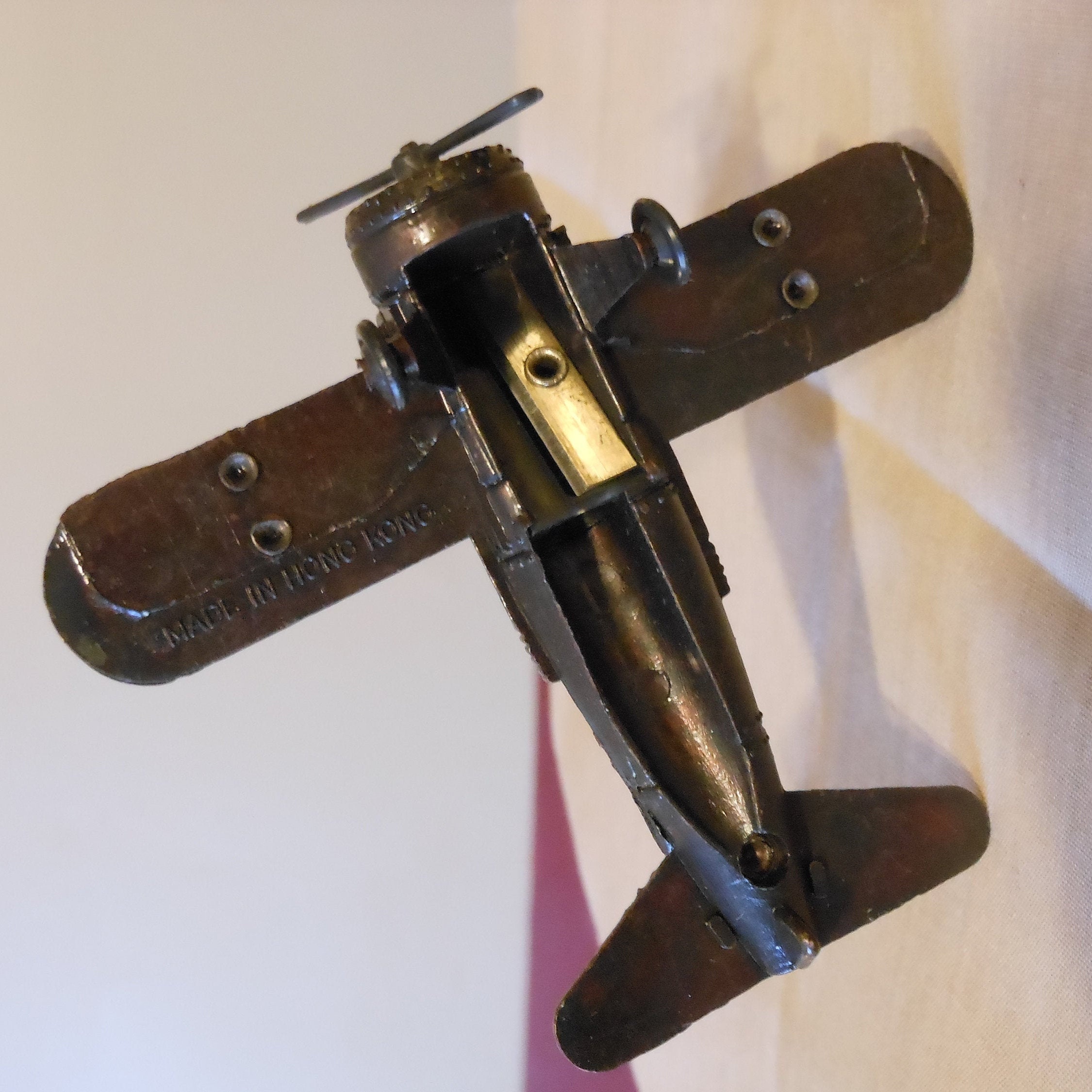 Die cast metal, antique finish bi-plane pencil sharpener. Made in Hong Kong. Measures 3.5 inches wide and 3 inches long. No box. Weighs 2 ounces.
