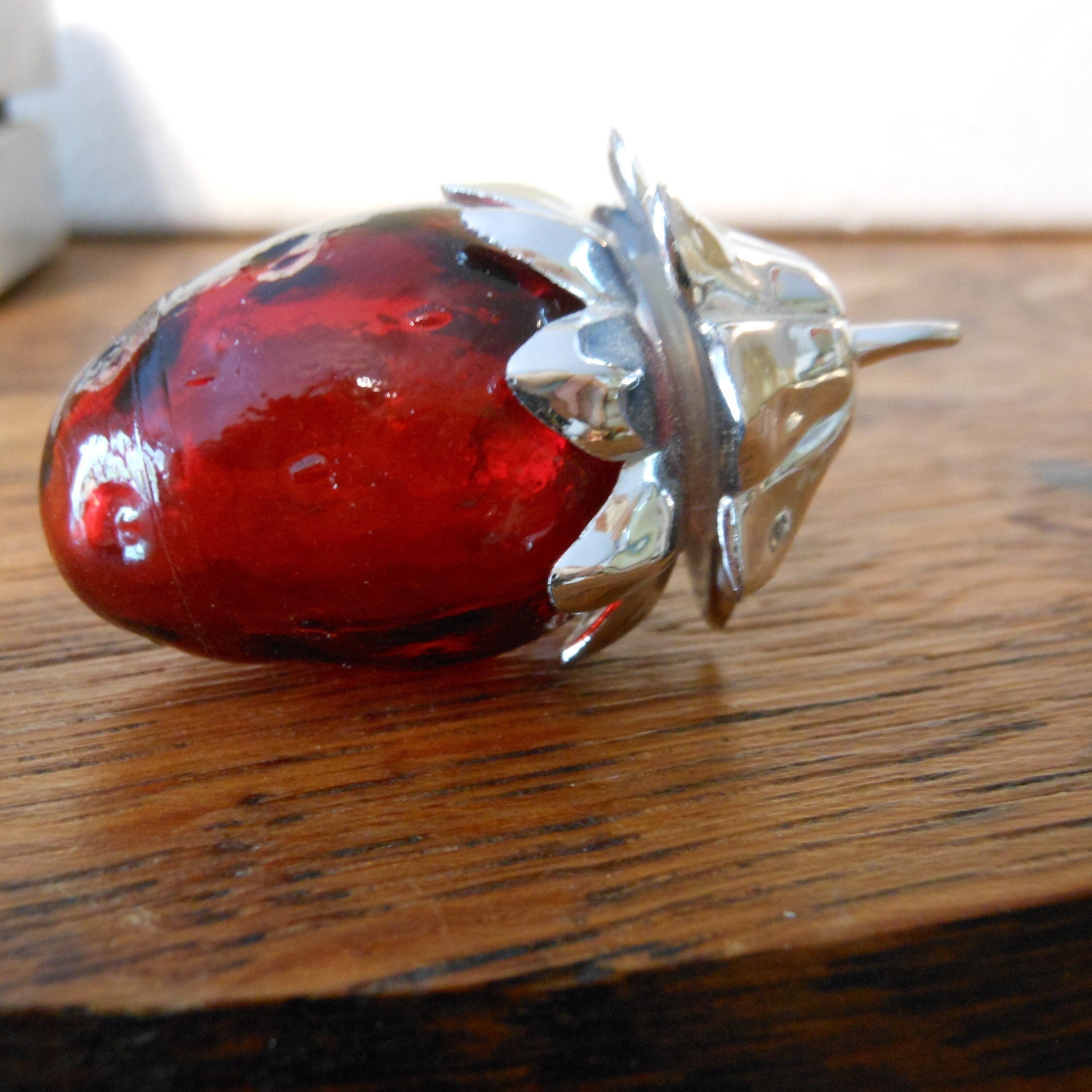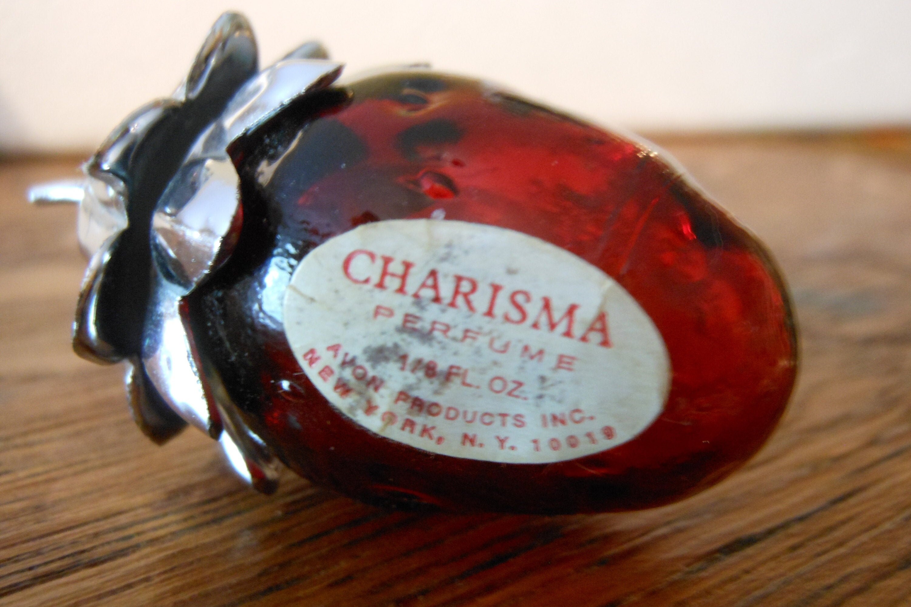 Two small Avon perfume vintage bottles. Charisma & Elusive are the fragrance names. Elusive still has 1/8th of a fluid ounce of perfume. The Charisma bottle, a red strawberry with a silver stem cap, is empty. The Elusive bottle is clear with a gold cap. Both bottles have their original labels. Glass bottles with metal caps. These bottles have a combined weight of 1 ounce.
